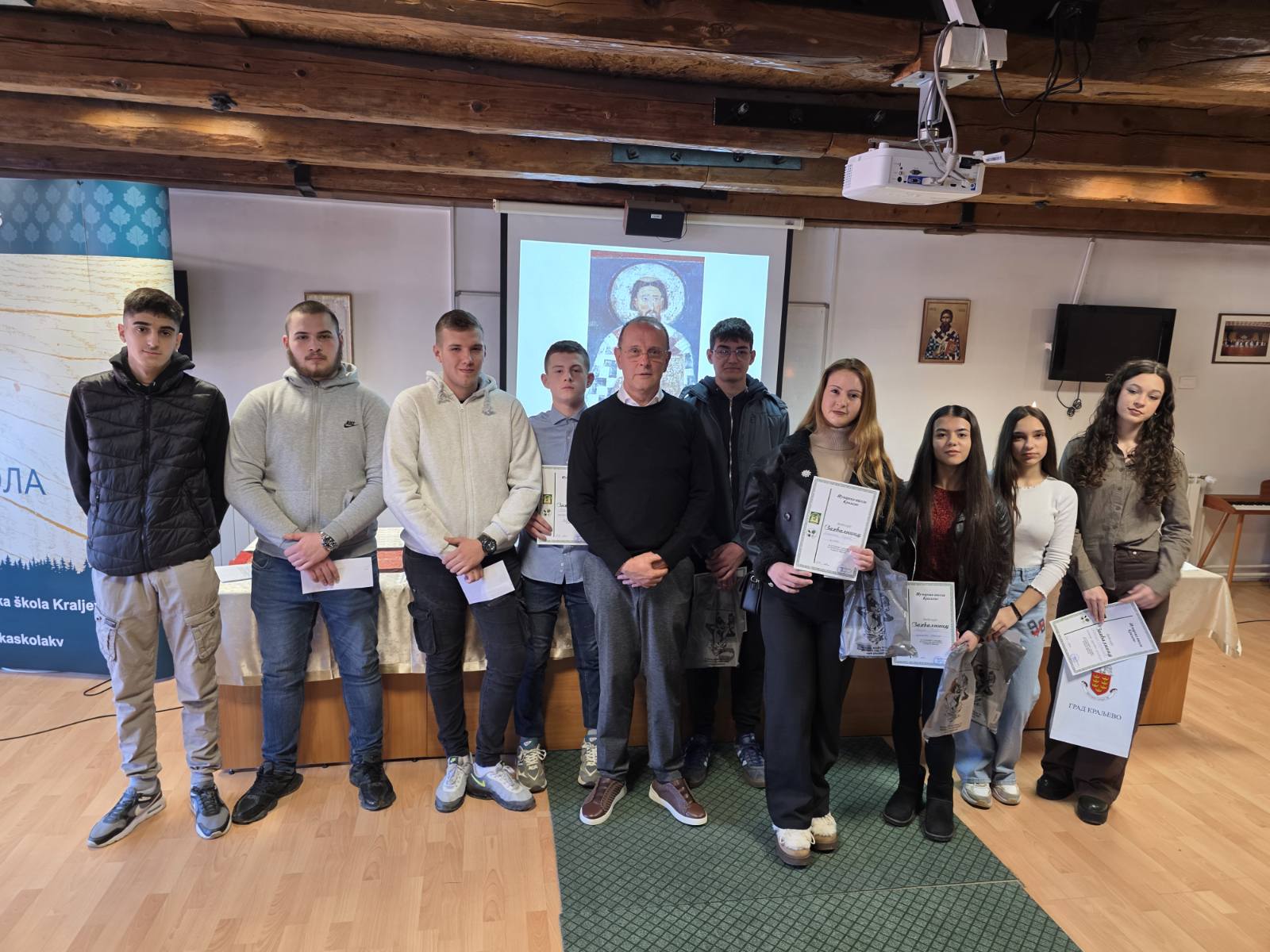 Ovaj veliki dan iskoristili smo da pohvalimo i vrednim poklonima nagradimo naše najbolje učenike. Direktor je za postignute rezultate i pokazano znanje u dosadašnjem školovanju uručio nagrade sledećim učenicima: